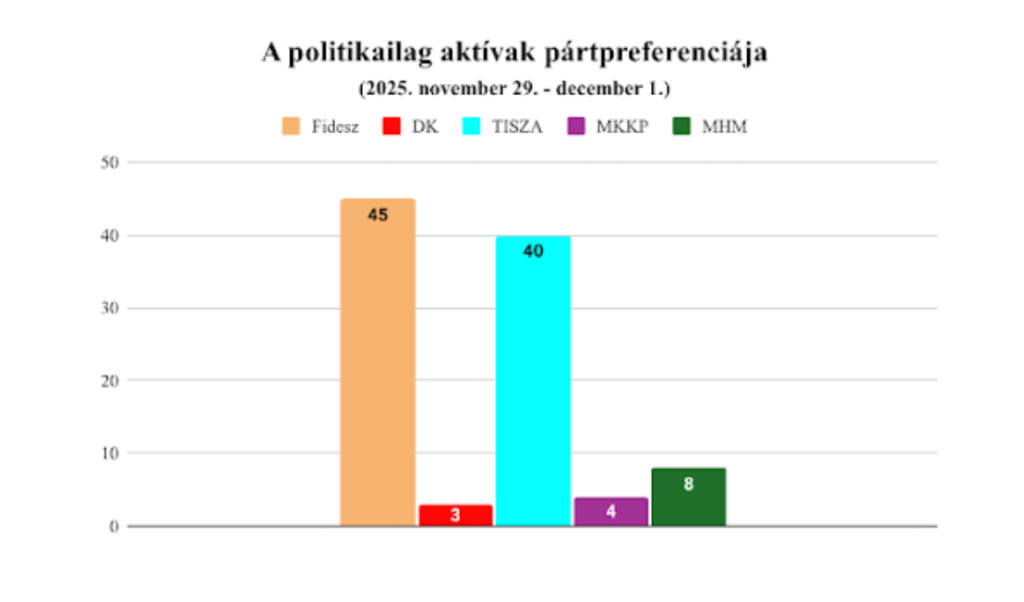 A legfrissebb közvéleménykutatás.Friss közvélemény-kutatást közölt a XXI. Század Intézet. Így alakul a pártok támogatottsága.A XXI. Század Intézet által november 29. és december 1. között végzett kutatása azt mutatja, hogy a Fidesz tovább tudott erősíteni a pozícióján (plusz egy százalékpontos javulás az október eleji méréshez képest), míg a Tisza rontott (mínusz egy pont).
